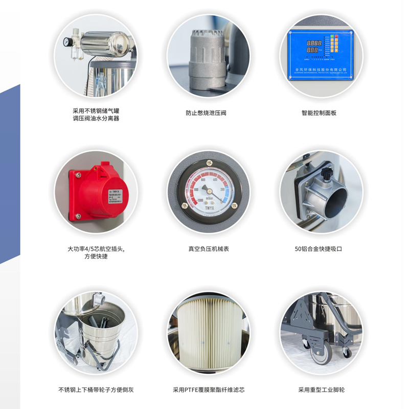 配备聚酯纤维覆膜滤网、旋风分离技术等,有效过滤微尘(甚至0.3μm颗粒),保护电机并避免二次污染。